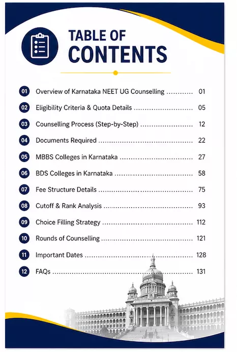 The Karnataka NEET UG Counselling Guide eBook in PDF is a complete and easy-to-understand resource for students preparing for MBBS and BDS admission in Karnataka. It covers the full counselling process conducted by KEA, including registration, document verification, choice filling, and seat allotment. This guide includes eligibility criteria, quota details, college list, fee structure, and previous year cutoff analysis to help you make informed decisions. You’ll also get expert choice filling tips and a document checklist to avoid common mistakes during counselling.